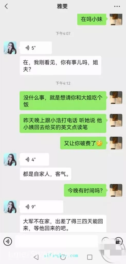 聊天记录头像让我截掉了没办法隐私重要明天周六了大姨子说她颈椎病犯了(教师的通病吧)我打算明天给她买些礼物去看看她正巧她也放假了而且重要的事我姐夫不在家有机会呀!