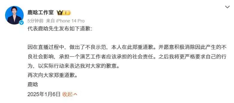 内娱顶流男星鹿晗因一场直播引发了全网的关注与争议,结果遭到全面禁止关注。这场直播中,他不仅酒后失态,还言辞激烈,甚至使用脏话、辱骂网友以及做出竖中指等极端行为,彻底触碰了公众的底线。这一系列不当举动引发了网络舆论的强烈反响,最终导致他在多个社交媒体平台上的账户被封禁,禁止关注。