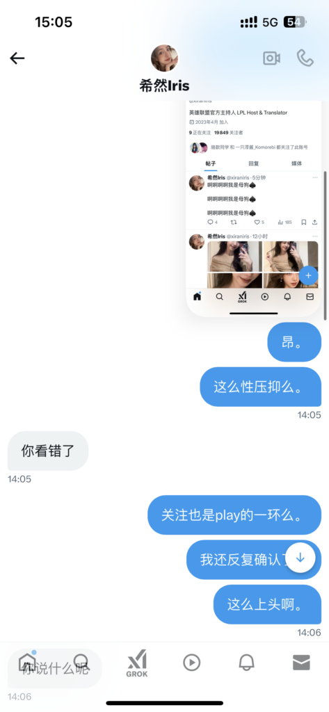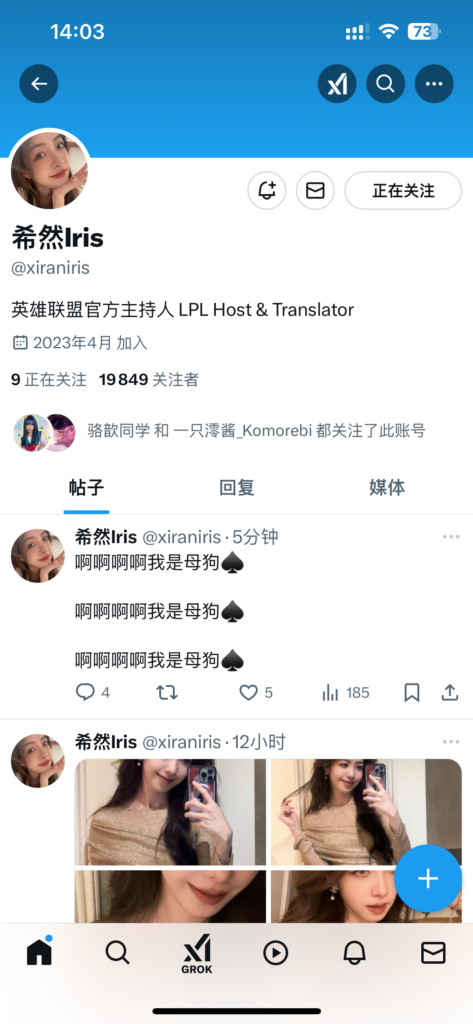 LPL最具影响力美女解说希然Iris,高超的业务素质中日韩三国语言翻译直播,高分颜值更是加分项,但最近却陷入大危机事件,其在推特的超劲爆发言被关注的粉丝光速截图留证,虽然其本人在内地平台紧急宣布没有推特账号,但还是被实锤这就是本人的发言。