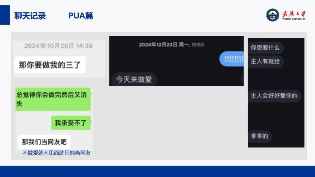 24页PPT揭露了武汉大学特聘副研究员的不当行为。他的师德败坏,令人失望,真可谓人渣中的人渣。同时,他与多名女生交往,向每位女生声称是真爱,简直可以称为顶级时间管理大师。他的一些经典言论更是毫无道德可言,彻底破坏了师德。他甚至扬言要“c满50个”。