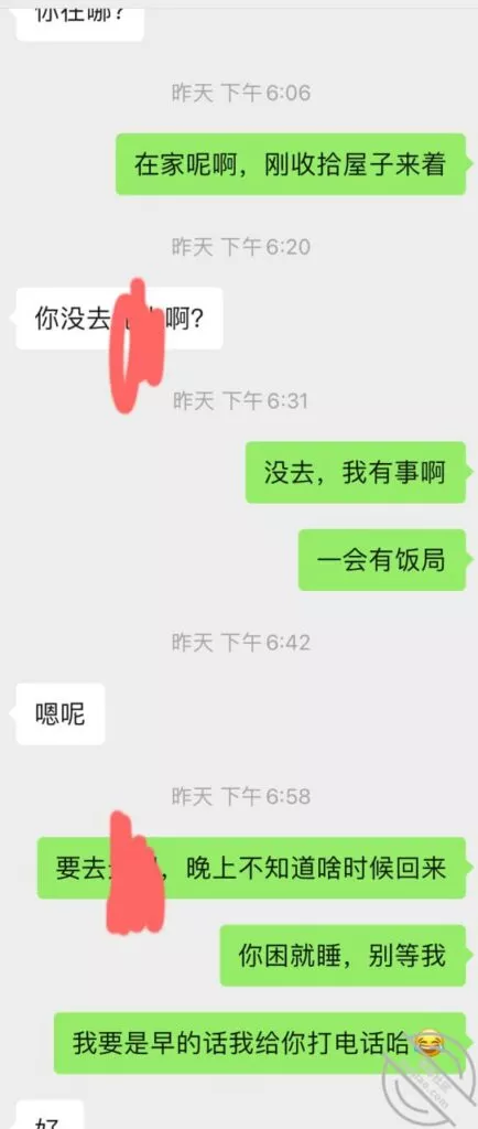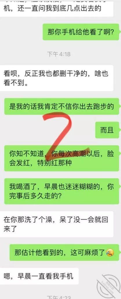 兄弟们差点出了大事啊,差点被他老公发现,幸好我们俩还都算机灵,然后她老公不算太机灵,不然可就惨了,后果不堪设想;事情是这样的,昨天她不是大早晨天刚亮就来找我Cao了一下吗,结果回去的时候她老公已经醒了,问题是她穿着睡衣出来的啊,我知道不管她怎么解释,她老公肯定是不会相信她的,现在心里肯定已经是怀疑她有人的,而且但凡有点脑子都能想到这个人肯定离得很近;先发聊天记录给大家看吧:以上就是昨天下午我俩的聊天记录了,本来昨天要发,结果呢临时有事情我要出去,才有时间登陆,兄弟们自己看吧;居然还跟踪她,这人脑子也是似乎有点不大够用,这种情况下跟踪能跟踪出个毛线啊,换了我,肯定装不知道啊,手机也不应该去查,就完全装不知道,完全相信她,叫她放松警惕,回头那不是一跟一个准啊,不过也算躲过一劫,真的要是被她老公知道我家地址,换了你们,会不会来敲门?这几天Cao不了了,还是暂且低调点吧,安全为主啊!也不知道这人啥时候走,我问她她也不知道,正好就当休息一下了。