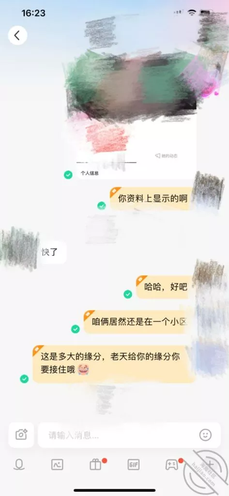 居然同小区,天底下有这么巧合的事情,电视剧都不敢这么演吧,事情是这样的,不是认识了某音上的一个已婚的女的,然后前些天我在momo上聊过的一个距离非常近的人,但是没有照片也没有头像,今天又想起来找她聊天,我想说看看她照片,结果………就这样了,朋友们自己看聊天记录吧,这个是momo的聊天记录,这个是某音的聊天记录。我真是万万没想到,天底下居然会有如此的巧合,居然是一个人,我们还住在一个小区,只是他没告诉我住在几幢。话说回来,我已经单身很久了,也很久没有性生活了。现在怎么突然感觉春天要来了,既然这么有缘分,那我必须努力把他拿下啊,《我的美女邻居》系列吗?啊哈哈哈哈哈,PS:由于第一次发帖没有经验,不会调整顺序,上一贴聊天记录完全乱了,但是大家应该能知道观看顺序吧,上面也带着时间,这个帖子也是,顺序好像是反过来的,如果接下来还有后续,我会把它调整好,如果不发了,那就是搞不定