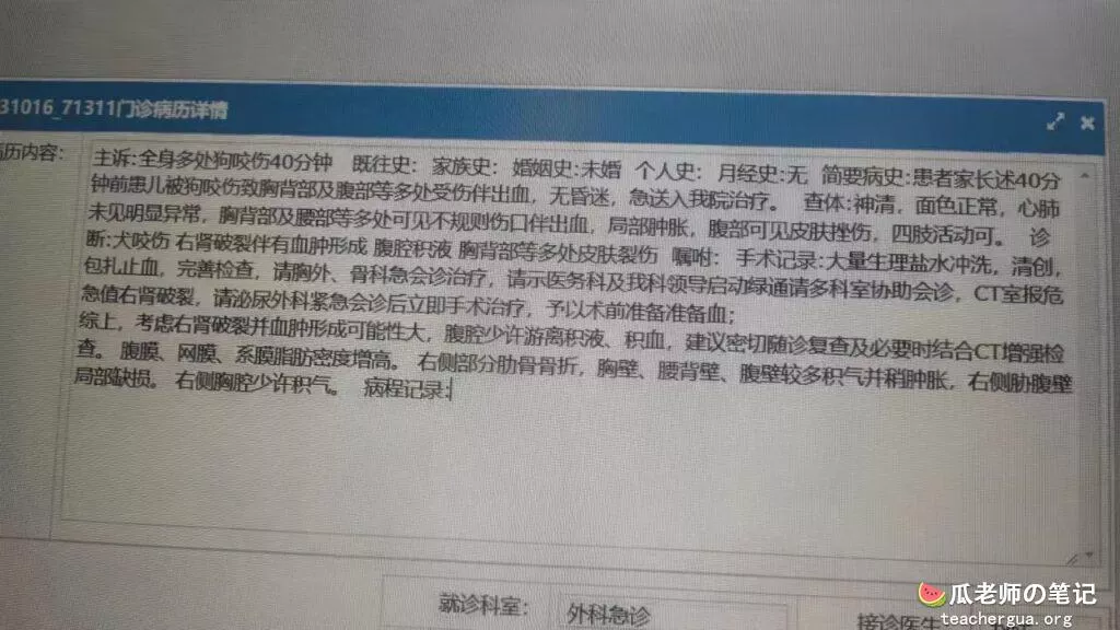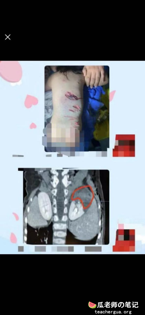 下面是急诊室给出的诊断结果,可以看到孩子身体多处受伤,有多出骨折,右肾脏破损。
